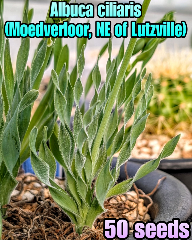 【Albuca ciliaris (Moedverloor, NE of Lutzville, RSA)】 ◎自家採種・2025年2月採種 ★★★★★ 毛の生えた葉が巻く、冬に生育するタイプのアルブカ。Gethyllisにも同じ“ciliaris(縁毛のある)”という種小名をもつ種があり雰囲気が似ていますが、花は典型的なアルブカのそれなので仲間ではないことが分かるでしょう。 巻き方は株の大きさにも依存し、大株になれば強く巻くようになる印象があります。 本種の分布は広いそうで、南はClanwilliam、北はRichtersveldのほうまで自生するといいます。 この系統はMoedverloor産です。Moedverloorという場所は北ケープ州のKamieskroon近くにも存在しますがそちらではなく、西ケープ州のKnersvlakte region、Lutzvilleの北東にある場所です。 ★★★★★