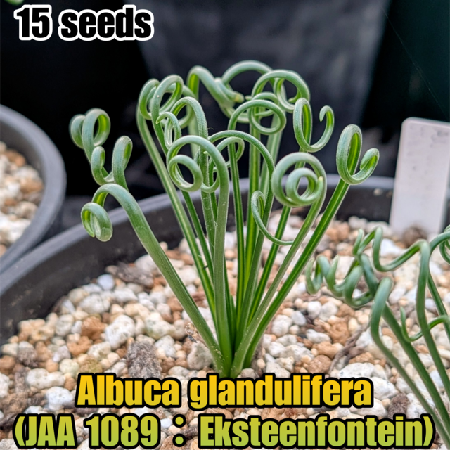 【Albuca glandulifera (JAA 1089:Eksteenfontein, RSA)】 ◎自家採種・2024年4月採種 ★★★★★ 南アフリカ北西部~ナミビア南部に分布する、葉の先端がコイル状に巻くアルブカ。葉の巻き方や腺毛がありベタベタする特徴はA. spiralisやA. foetidaによく似ますが、それらとは花の形態が大きく異なります。 典型的な冬生育型のアルブカで、夏には球根のみとなって休眠します。 種小名の“glandulifera”は“腺をもった”という意味です。Albucaには他にA. glandulosaという字面と意味がほぼ同じ種が存在し、やはり葉に腺毛が生えるのですが、それは葉が巻くことはなく花の形態も異なります。 ★★★★★