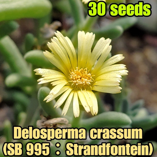 【Delosperma crassum (SB 995:Strandfontein, RSA)】 ◎自家採種・2023年11月採種 ★★★★★ 南アフリカ南西部の冬に降雨がある地域に自生する、潅木状に育つメセン。 枝の先端に黄色の花をたくさん咲かせます。 性質はかなり頑丈なほうで、零れ種から育つこともよくあります。 ★★★★★