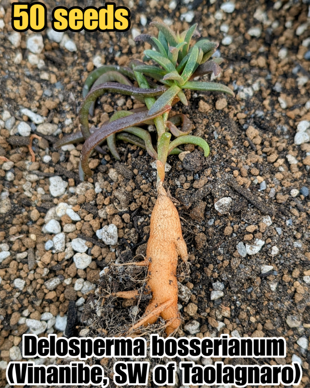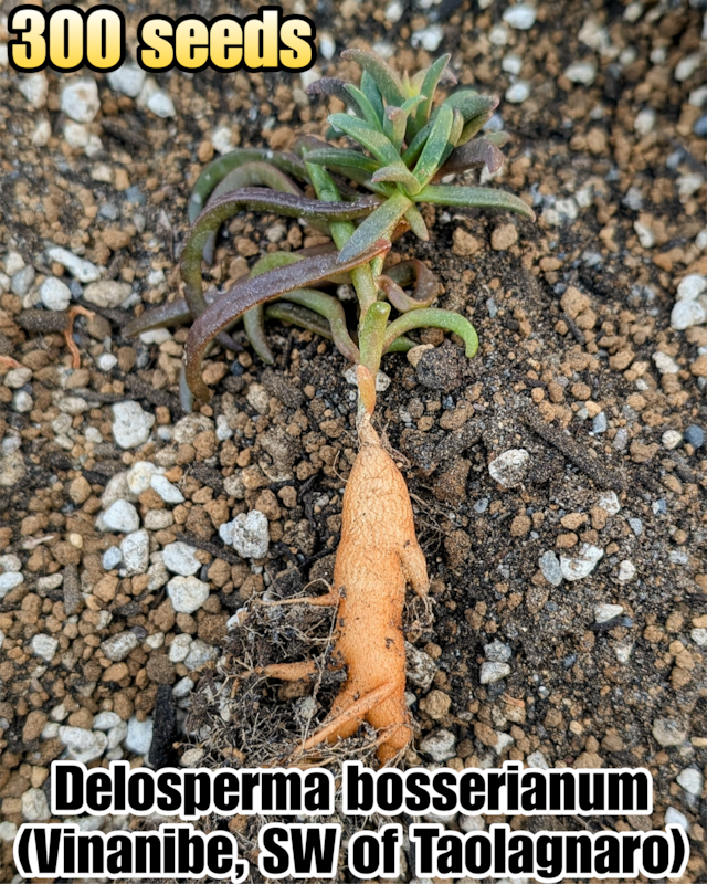 【Delosperma bosserianum (Vinanibe, SW of Taolagnaro, Madagascar)】 ◎自家採種・2025年3月採種 ★★★★★ 南アフリカではなく、マダガスカル南部に固有のメセン。花は小さく目立ちませんが、勝手に自家結実し、地中には塊根をつくります。 こちらの系統はマダガスカル南東部、Taolagnaroの近くに位置するVinanibe産のものです。 マダガスカルの東にあるレユニオン島には、本種と非常に近似するD. napiformeという種も存在します。果実の形態がやや異なるそうですが、具体的な違いは当方でもよくわかっていません。 なお本種の種小名は元々“bosseranum”として記載されましたが、命名規約に従うと“bosserianum”が正しいそうです。 本種は相当丈夫な植物で、零れ種からでもよく殖えます。地中にできる塊根はある程度のサイズに育ったら地表に露出させ、盆栽のようにして楽しむことも可能です。 ★★★★★