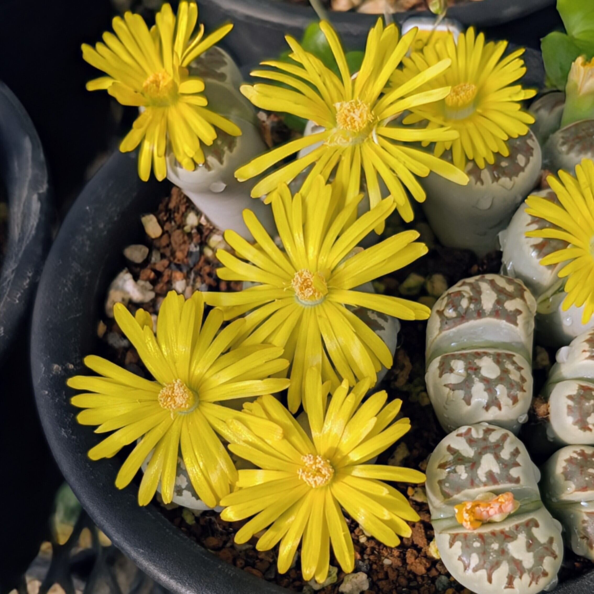 「麗虹玉」の和名があるリトープス。黄色っぽい体と頂部の“窓”にある赤い模様が綺麗な種です。
