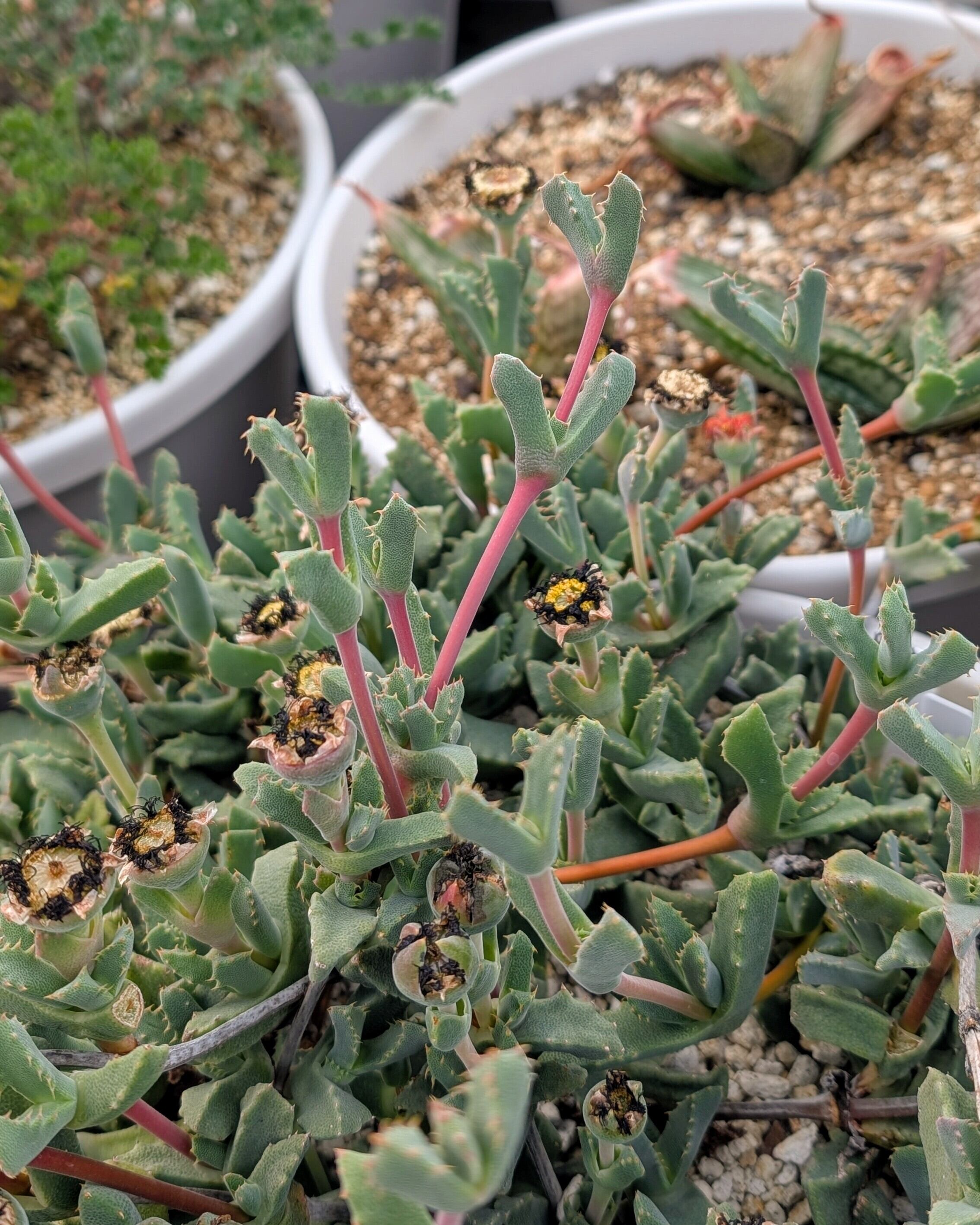 株元に葉を群生させるのはケイリドプシスらしいですが、本種はそこから節間の長い細く木質の枝を伸ばします。この仲間では珍しい特徴です。