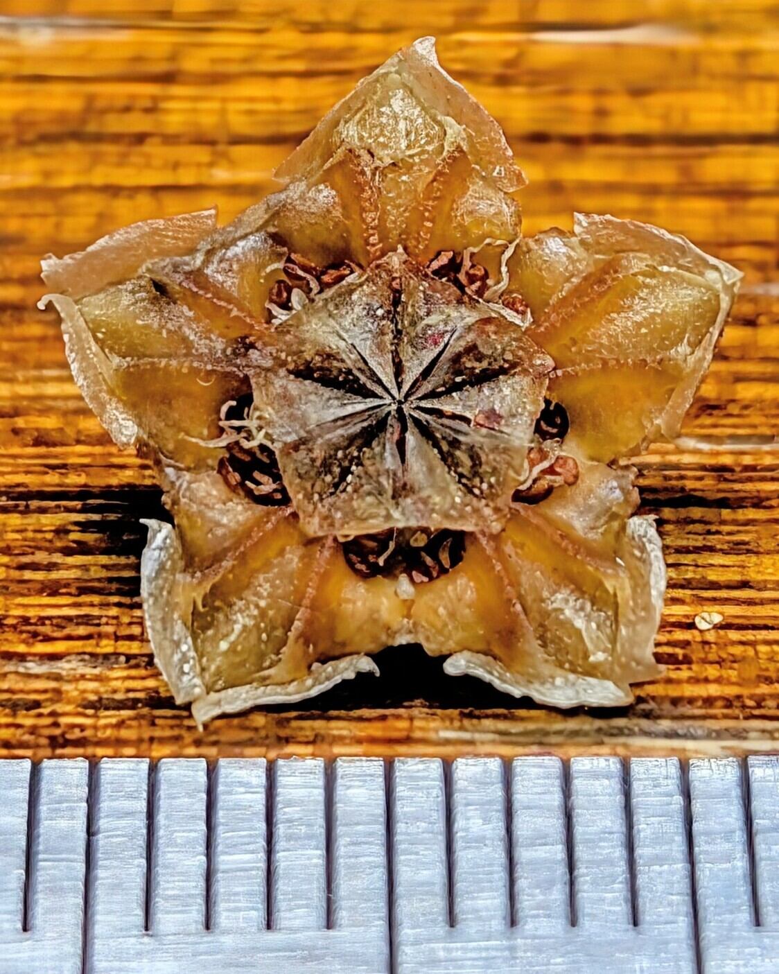 本種はDrosanthemumの亜属、subgenus Speciosaに分類されます。この亜属の多くの種には花に黒い“糸状の仮雄蕊/filamentous staminodes”が存在するのが特徴ですが、本種とD. cereale, D. chrysumにはそれがありません。しかし果実/カプセルの基部が丸みを帯びる代わりに5つの隆起があり、断面が五角形になる点は同じです(※写真3枚目、少々分かりにくいですが)。