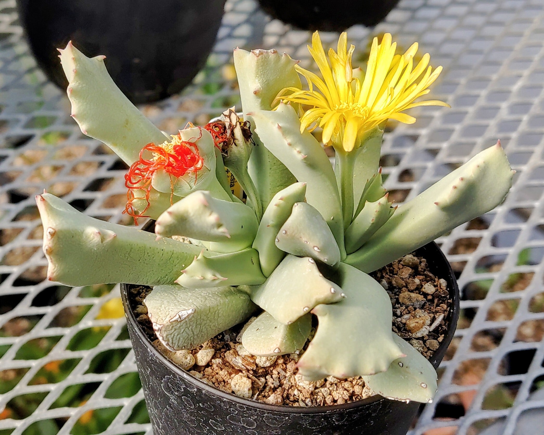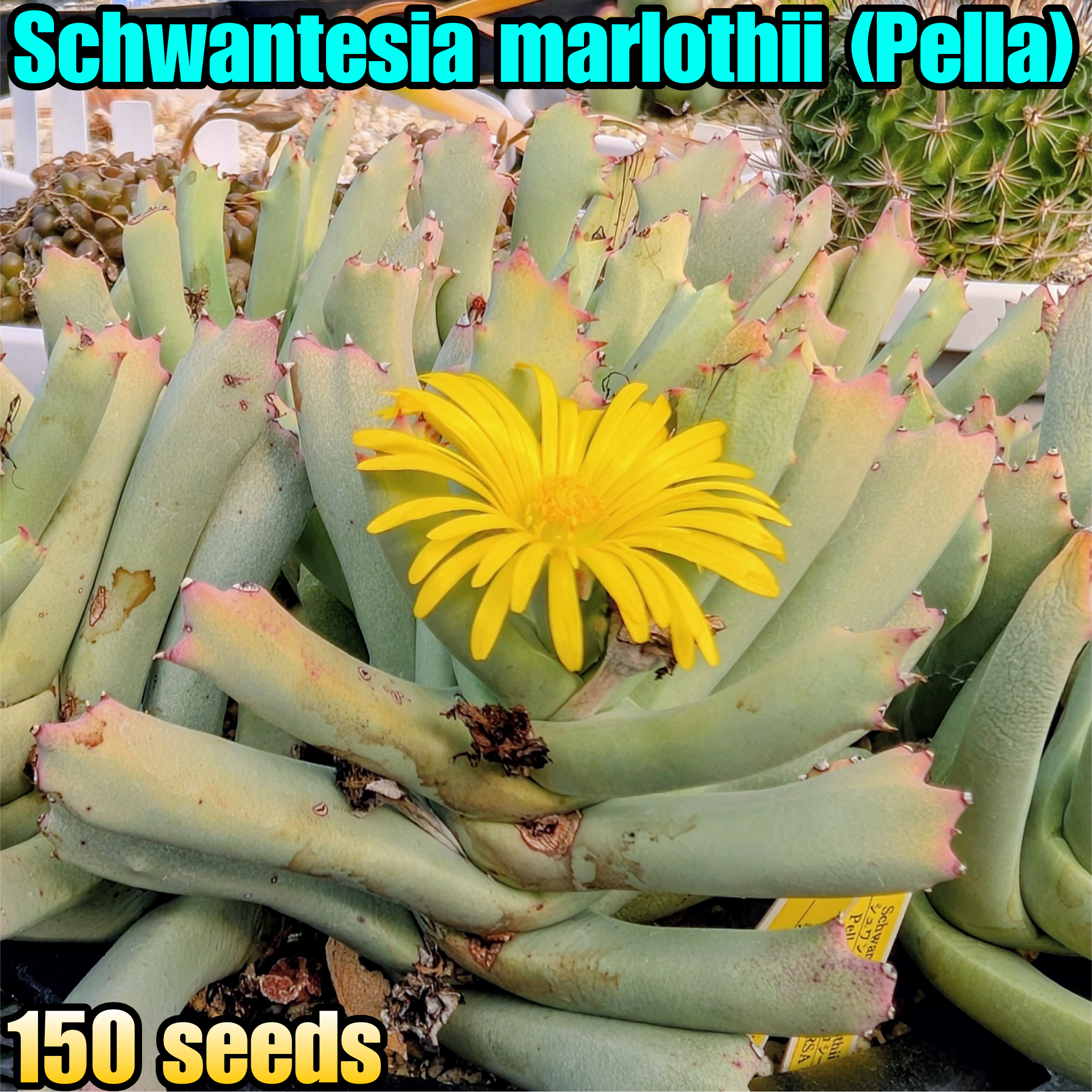 シュワンテシアという属のメセンはニッチでほとんど知られていないと思いますが、丈夫で栽培しやすく、ブルーグリーンの葉と黄色の花が美しい植物たちです。