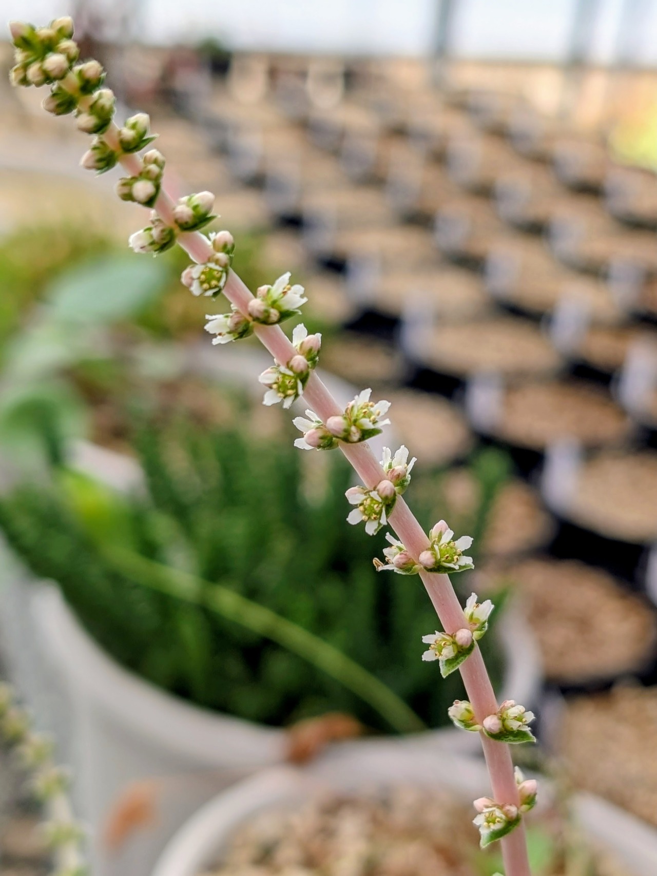 開花期になると成長点部が花序に変化し、長い花茎を伸ばしてそこから小さな花を咲かせます。