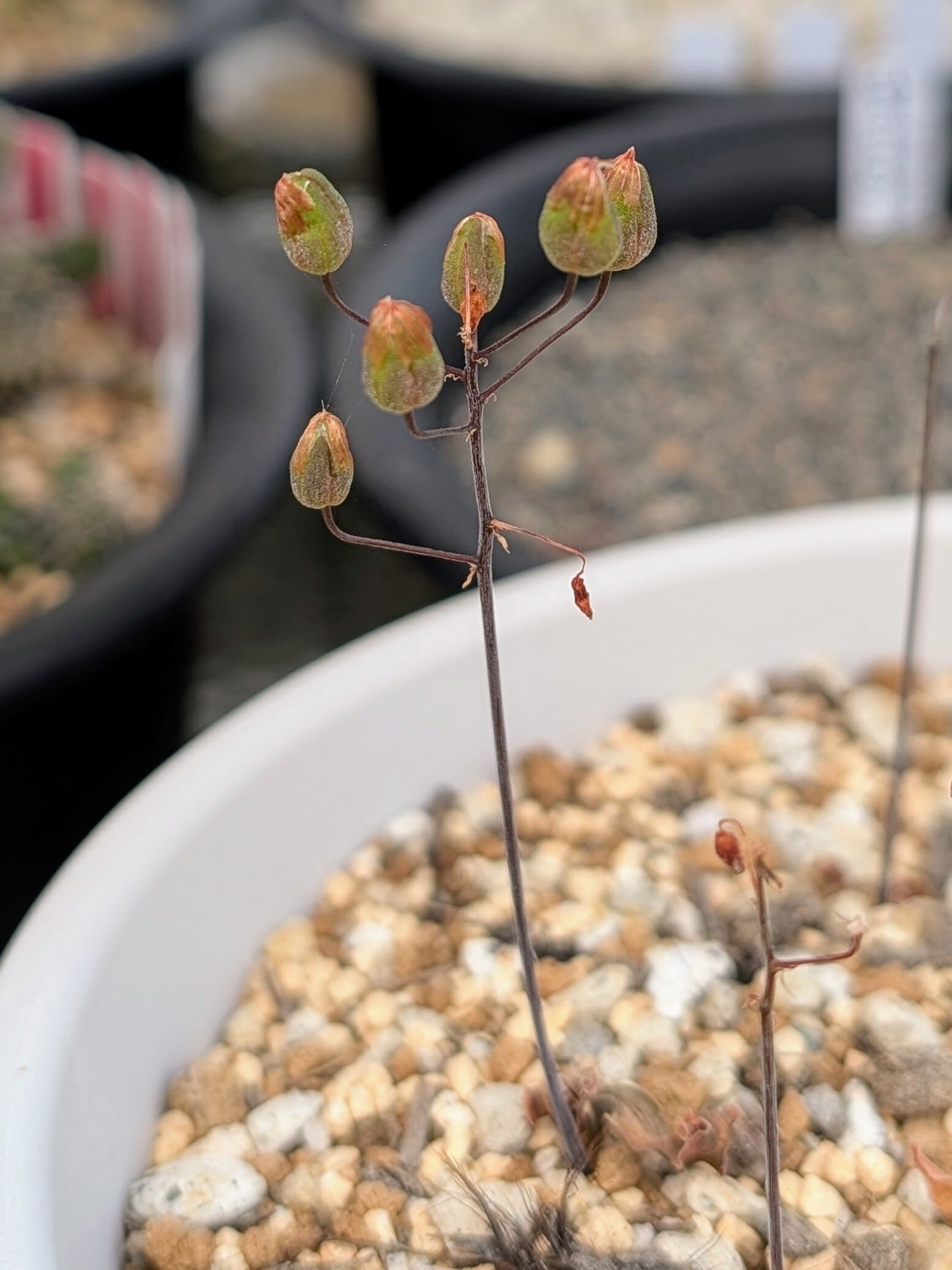 葉が枯れた後に咲く花はベル状で、自家受粉で結実が可能です。