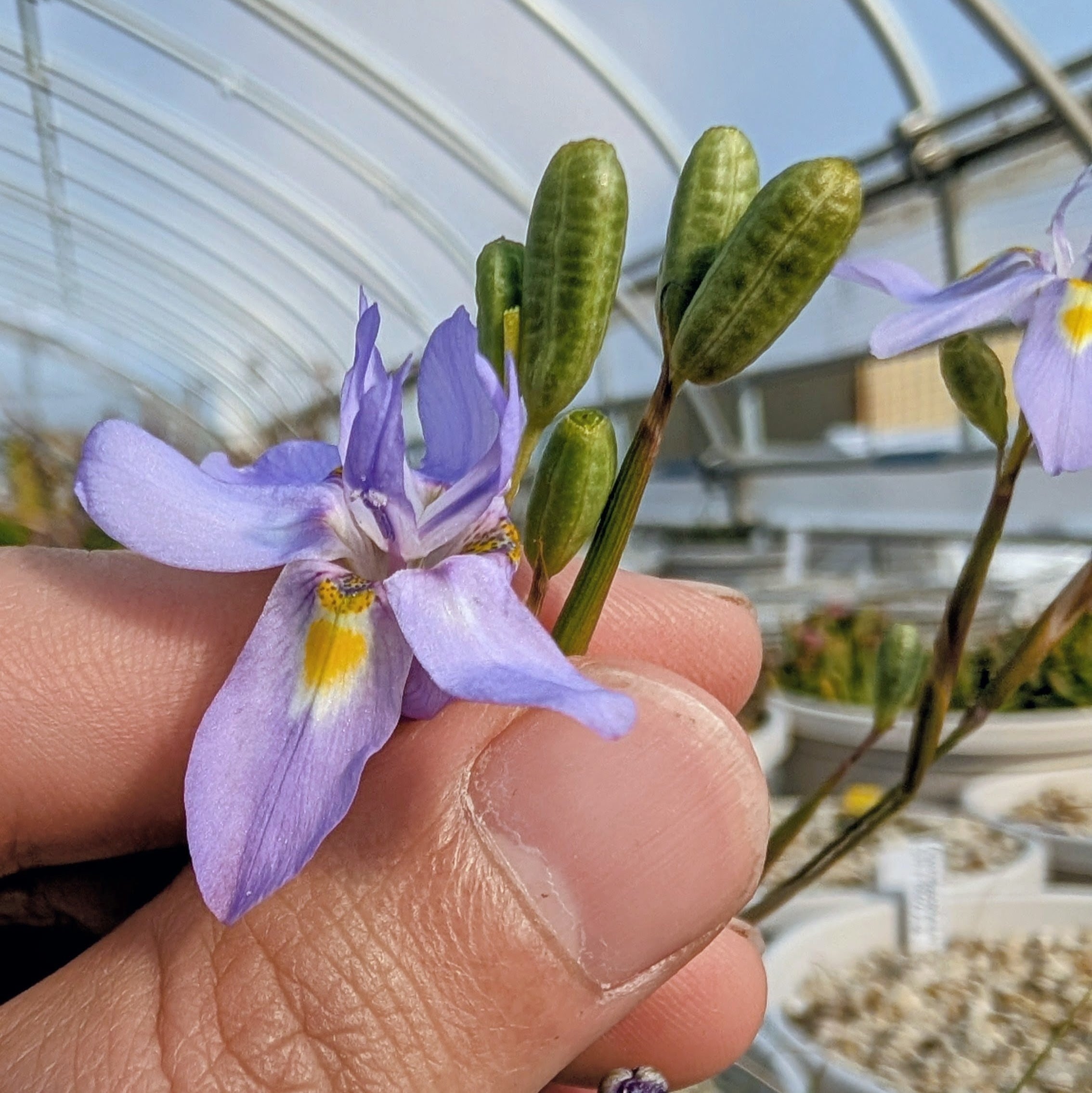 モラエア属の花の形態はアヤメ属/Irisのものとよく似ています。一見すると何処に雄しべや雌しべがあるのかわからないですが、画像6枚目の通り花中央に3つある花被片の一部にみえる部分に雄しべの葯/antherがあり、そのすぐ上にある襞が雌しべの柱頭/stigmaになっています。人工授粉させる際は爪楊枝などで花粉を掬い、襞になっている柱頭に乗せる方法がやりやすいと思います。