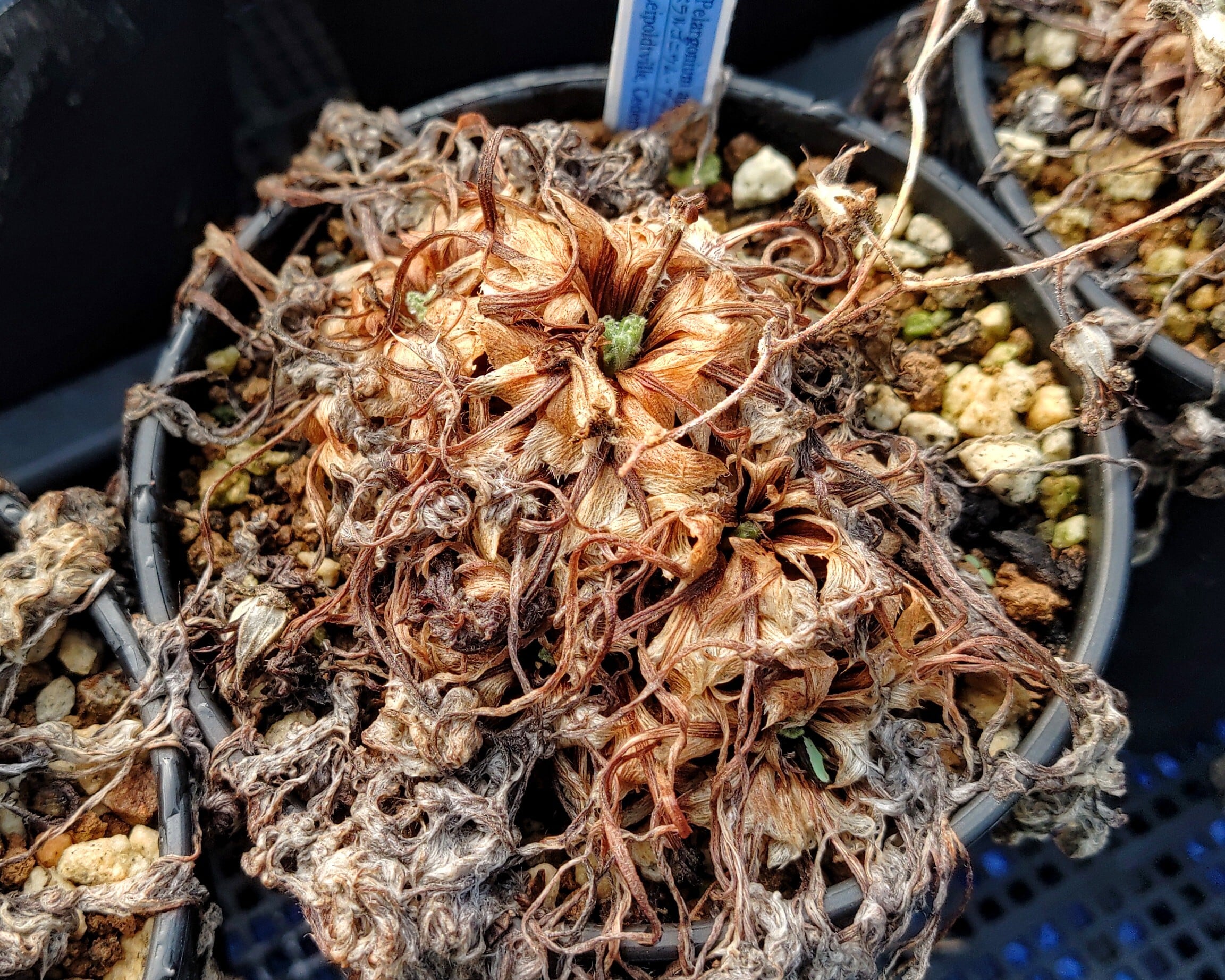 上記の通り冬の間は太く短い枝からふわふわした葉を伸ばし、落葉が近づく3月ごろになると花茎を伸ばしマゼンタのブロッチが入った花を咲かせます。夏に葉が枯れても托葉は残り続け、その姿はさながら枯れ草のようですが秋になるとちゃんとまた芽吹きます。夏の姿も一見の価値がある植物です。
