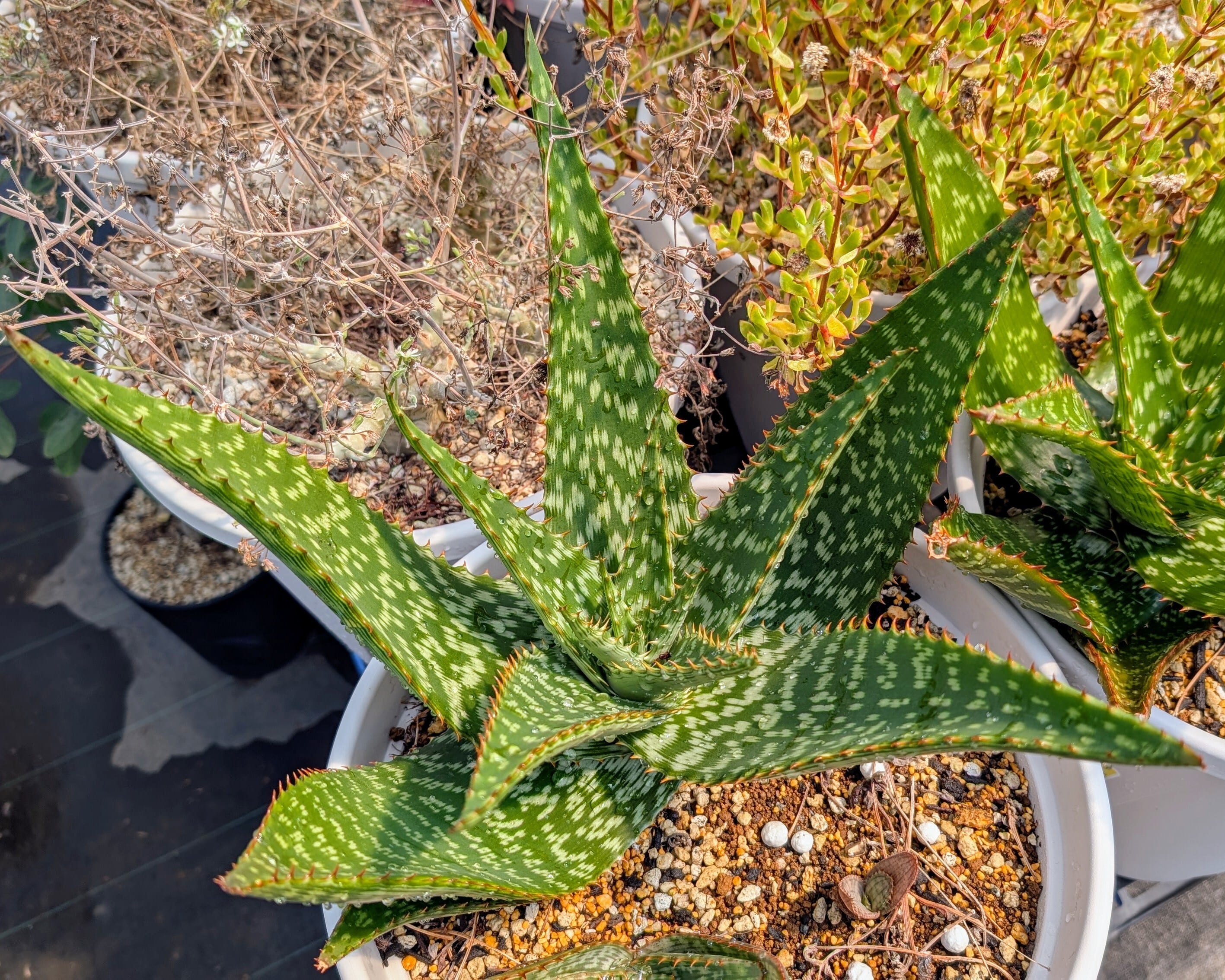 南アフリカ北東部に分布する、葉の表面の斑点が特徴であるmaculate Aloeの一種。このmaculate Aloeといわれるグループは近似種が非常に多く、原種にこだわるのであれば産地ごとに蒐集するのが確実です。