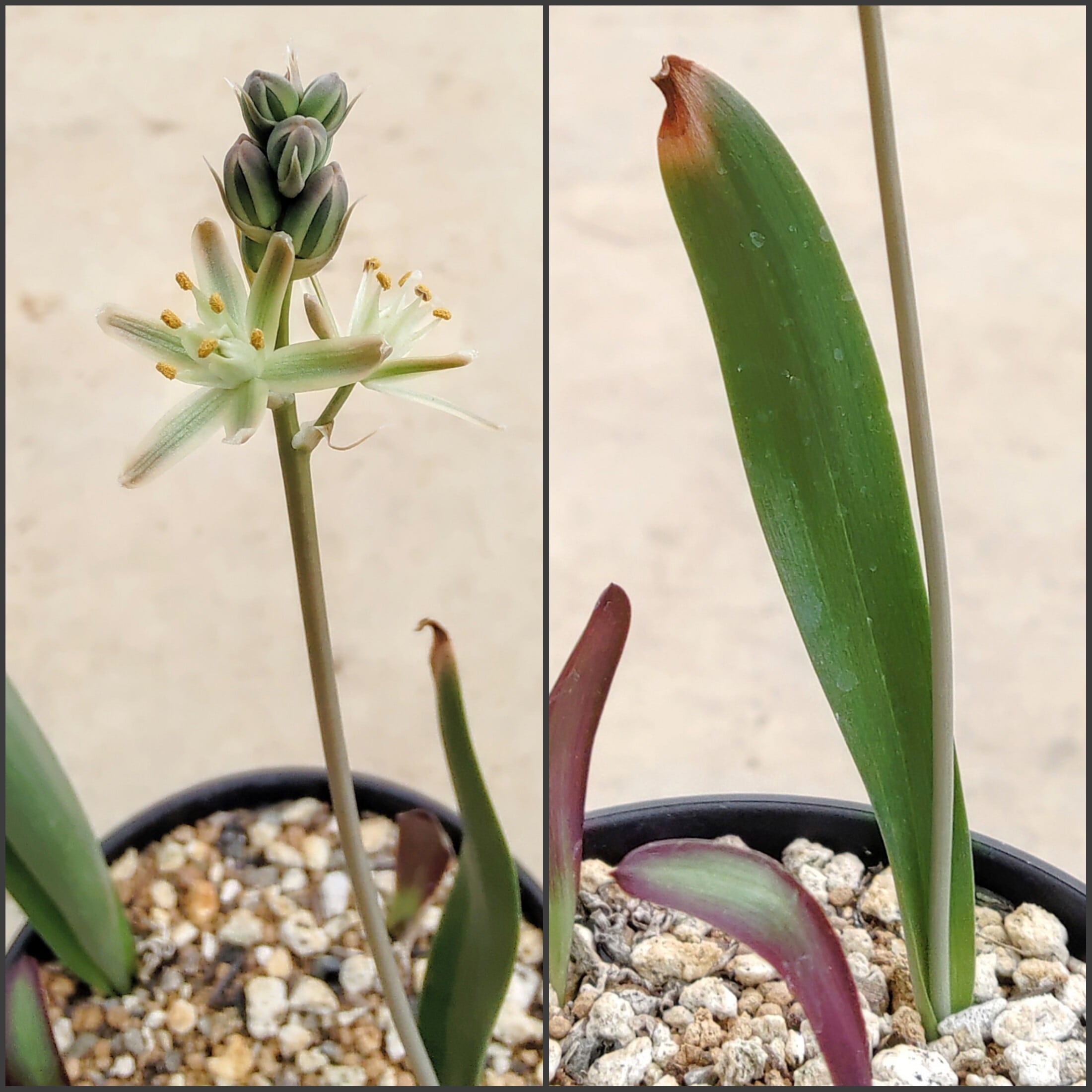 Albuca unifoliataは学名が非常によく似ているものの、棍棒状の葉をもつ姿の大きく異なる別種なので注意。