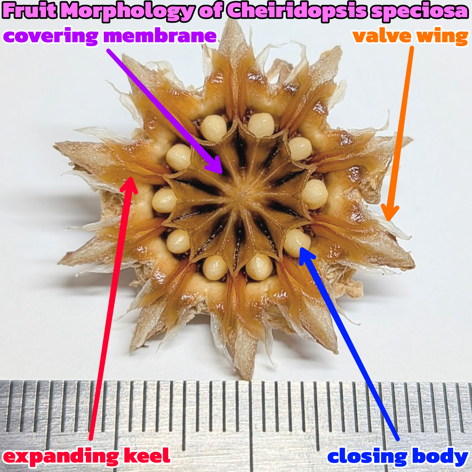 本種とC. excavataは果実(カプセル)内部にある“closing body”という構造が小さい点を理由にかつてIhlenfeldtiaという属に分類されたこともありましたが、分子系統解析の結果ではこれら2種はCheiridopsisに3つある亜属の1つ、subg. Aequifoliaeに収まってしまうそう。C. vanzyliiと、subg. Odontophoroidesに分類されるC. speciosaのカプセルの内部構造の比較は画像5・6枚目をご覧ください。