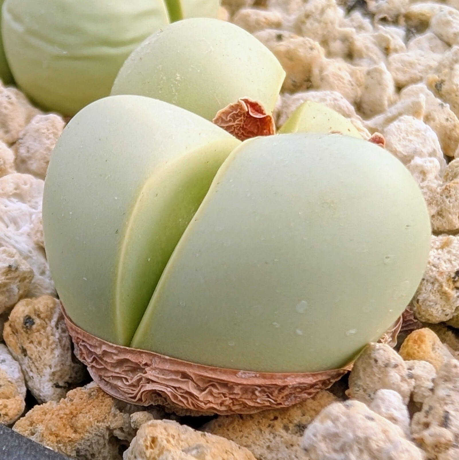 葉のペアが球形に近い、葉のキールが存在しない、株がほとんど分岐しない点から、当方ではA. pearsoniiと同定しました。後のADBLPSのカタログでもA. pearsoniiとして掲載されています。