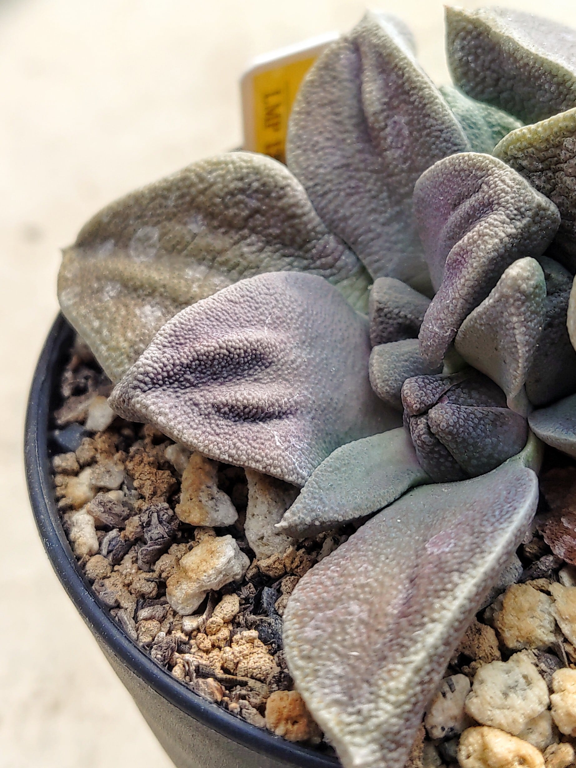 大きな塊根ができるメセン。塊根部は完全に地中に埋まっており、葉のみを地表に広げるのが本来の姿ですが、植え替え時に多少露出させて栽培することも可能です。