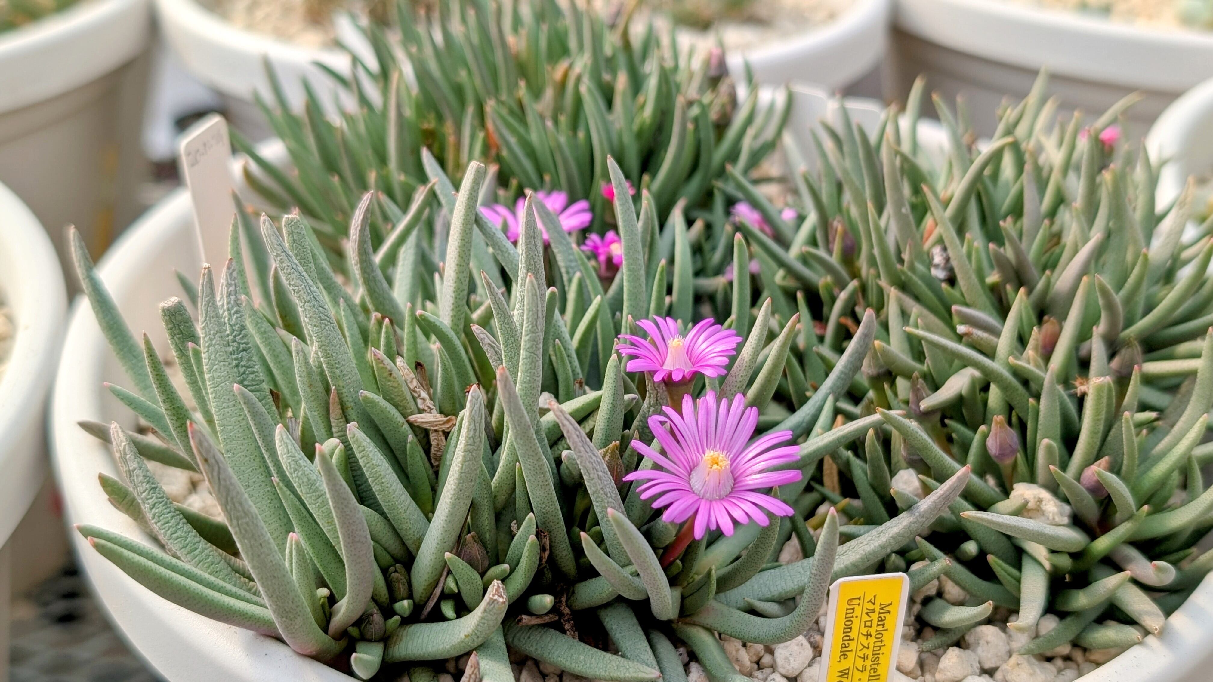 一見すると芝のようなメセン。開花期以外は全く派手さはありませんが、冬になるとピンク色の花を大量に咲かせ、とても豪華な姿になります。